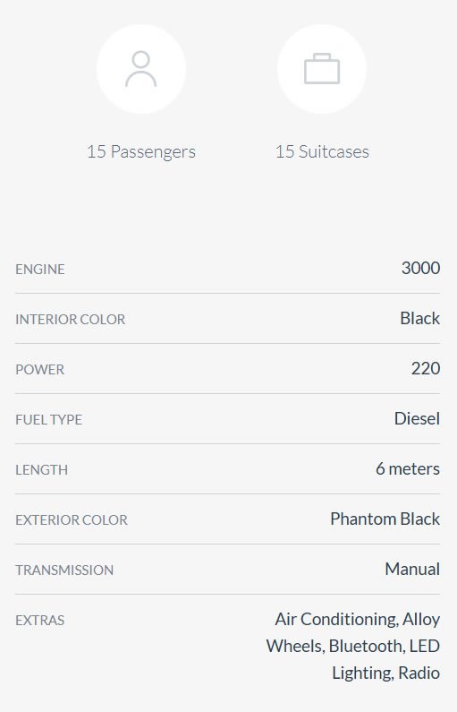 Comfortable Van with plenty of leg room and a spacious trunk. A great vehicle to travel in if you are looking for a cost effective way to get a group from A to B. Seats up to 15 passengers.